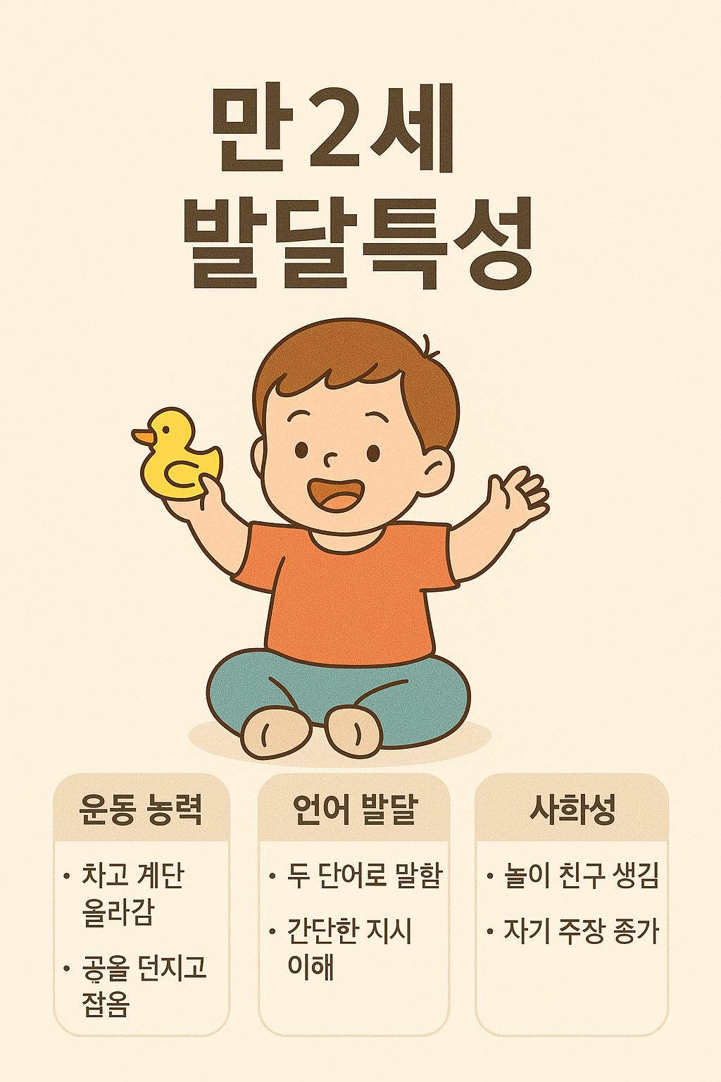 만 2세(대략 생후 24~36개월)는 ‘스스로 해보려는 마음’과 ‘배우는 속도’가 동시에 커지는 전환기다. 만 1세에 얻은 보행과 기초 언어가 하루가 다르게 확장되며, 놀이와 상호작용 속에서 사고방식이 급격히 발달한다. 이 시기의 아이는 세상을 몸으로 탐험하고, 말을 통해 요구를 표현하며, 놀이로 경험을 재구성한다. 그래서 같은 하루라도 환경과 상호작용의 질에 따라 배움의 양상이 크게 달라진다. 신체적으로는 균형과 민첩성이 눈에 띄게 좋아지고, 인지적으로는 상징적 사고와 원인·결과의 연결이 뚜렷해지며, 사회 정서적으로는 자율성과 고집, 공감의 싹이 함께 자란다. 언어는 단어의 폭발적 증가에서 간단한 문장 사용으로 넘어가고, 일상 기술(스스로 먹기, 옷 입고 벗기, 배변 준비 신호 등)의 독립성이 조금씩 자리 잡는다. 신체 발달부터 보면, 만 2세는 달리기와 멈추기, 방향 전환처럼 ‘속도 조절’이 가능해지고, 낮은 곳에서 뛰어내리기, 공을 던지고 차기 같은 전신 협응 활동을 즐긴다. 계단은 올라갈 때 한 발씩 번갈아 디디는 모습을 보이기 위해 시작하지만 내려올 때는 아직 한 칸씩 조심스레 이동하는 경우가 많다. 균형감이 좋아지면서 소파나 낮은 의자에 오르내리고, 낮은 평균대나 경사로에서 균형을 잡아 보려고 시도한다. 소근육 발달도 가파르다. 4~6개의 블록을 쌓고, 큰 단추를 끼우거나 간단한 끈 꿰기를 시도하며, 스크루 뚜껑을 돌려 여닫는다. 숟가락 사용은 흘림이 줄고, 포크로 부드러운 음식을 찍어 먹기도 한다. 그림책 페이지를 한 장씩 넘기고, 원 혹은 세로선·가로선 같은 기초 형태의 낙서를 반복하며 원형 그리기로 발전하는 아이도 많다. 이러한 손의 정교함은 퍼즐(2~4조각) 다루기나 소도구 조작으로 이어져 인지 발달과 놀이의 폭을 넓힌다. 인지 발달은 상징 놀이의 확장으로 드러난다. 만 2세는 인형에게 밥을 먹이는 척, 전화기로 통화하는 척, 의자를 버스로 삼아 “출발”을 외치는 식으로 실제 경험을 상징으로 재현한다. 이는 눈앞의 사물과 머릿속 표상을 연결하는 능력이 자라났다는 뜻이며, 문제 해결에서도 작은 ‘계획’이 보인다. 예를 들어 높은 선반의 장난감을 가져오기 위해 상자를 밀어 발판으로 쓰거나, 막힌 블록 구조를 바꾸기 위해 한두 개를 빼서 다시 쌓는 등 시행착오 속에서 효율적인 전략을 찾는다. 분류와 비교의 초기도 관찰된다. 색이나 모양, 크기 기준으로 장난감을 모아 놓거나, “큰 것/작은 것”을 구분하는 말과 행동이 맞물린다. 시간과 공간 개념은 아직 미성숙하나, “먼저~그다음~” 같은 간단한 순서를 따라 하거나, 집→놀이터→집처럼 익숙한 동선을 기억한다. 지시 이해도는 한 단계 올라 ‘두 단계 지시’를 따르는 일이 늘어난다(“책상 위 컵 갖고 와서 엄마에게 줘”). 다만 사고의 중심은 여전히 자기 관점에 머무는 경우가 많아, 규칙을 이해해도 충동이 앞서 실행이 흔들리기 쉽다. 언어는 이 시기의 하이라이트다. 단어 수가 급격히 늘고, 조사가 매끄럽지 않아도 “엄마 이거 해”, “물 더 줘”, “강아지 자요”처럼 두세 낱말을 이어 간단한 문장을 만든다. 사물 명·사람 호칭에서 동작·상태표현으로 확장되며, 의문문 사용이 폭발한다(“왜?”, “어디?”, “누구?”). 말보다 먼저 자라는 ‘듣기’ 능력 덕분에 일상 지시를 상당 부분 이해하고, 낯선 단어도 맥락으로 추측한다. 발음은 또박또박하지 않더라도 의사소통 의지가 강해 비언어 신호(손짓, 시선, 몸 방향)와 말을 함께 사용한다. 반복적인 책 읽기, 노랫말 따라 하기, 일상 활동을 말로 묘사해 주는 ‘내러티브 양육’은 어휘와 문장 구조의 성장을 돕는다. 사회정서 발달에서는 자율성과 한계 설정이 부딪히며 소위 ‘고집·투정(떼쓰기)’이 잦아진다. 에릭슨의 관점에서 이 시기의 과업은 ‘자율성 대 수치심·회의’로, 스스로 하려는 시도를 존중받으면 자기효능감이 자라고, 반복된 제지·비난은 위축과 저항을 낳는다. 따라서 “안전한 실패”의 기회를 충분히 주고, 선택지를 두세 개로 제한해 아이가 통제감을 느끼게 하는 것이 효과적이다(“빨간 양말로 신을래, 파란 양말로 신을래?”). 감정 조절은 아직 미완성이라 좌절 시 격렬한 표현이 나타나지만, 공감의 싹도 분명하다. 울고 있는 또래에게 휴지를 가져다주거나 등을 토닥이는 모습, 아픈 장난감에 밴드를 붙이는 상징적 돌봄은 정서 이해의 발아다. 애착 관점에서 주 양육자는 여전히 ‘안전기지’이며, 낯선 상황에서 탐색→확인(양육자에게 돌아와 재충전)→재탐색의 리듬이 안정감을 준다. 또래와의 놀이는 대부분 병행 놀이나, 간단한 역할 나눔과 모방이 늘며 느슨한 협력의 실마리가 보인다. “내 거” 경계는 강해 공유·순번 지키기가 어렵지만, 짧고 구체적인 규칙과 모형화로 점차 학습된다. 생활 기술의 독립성도 크게 전진한다. 숟가락·컵 사용이 안정되고, 간식·식사에서 ‘까다로운 먹기’가 두드러지기도 한다. 이는 성장 속도가 다소 둔화하며 나타나는 흔한 패턴으로, 양을 강요하기보다 규칙적인 식사 시간, 다양한 식재료의 반복 노출, 긍정적 식탁 분위기가 도움이 된다. 배변