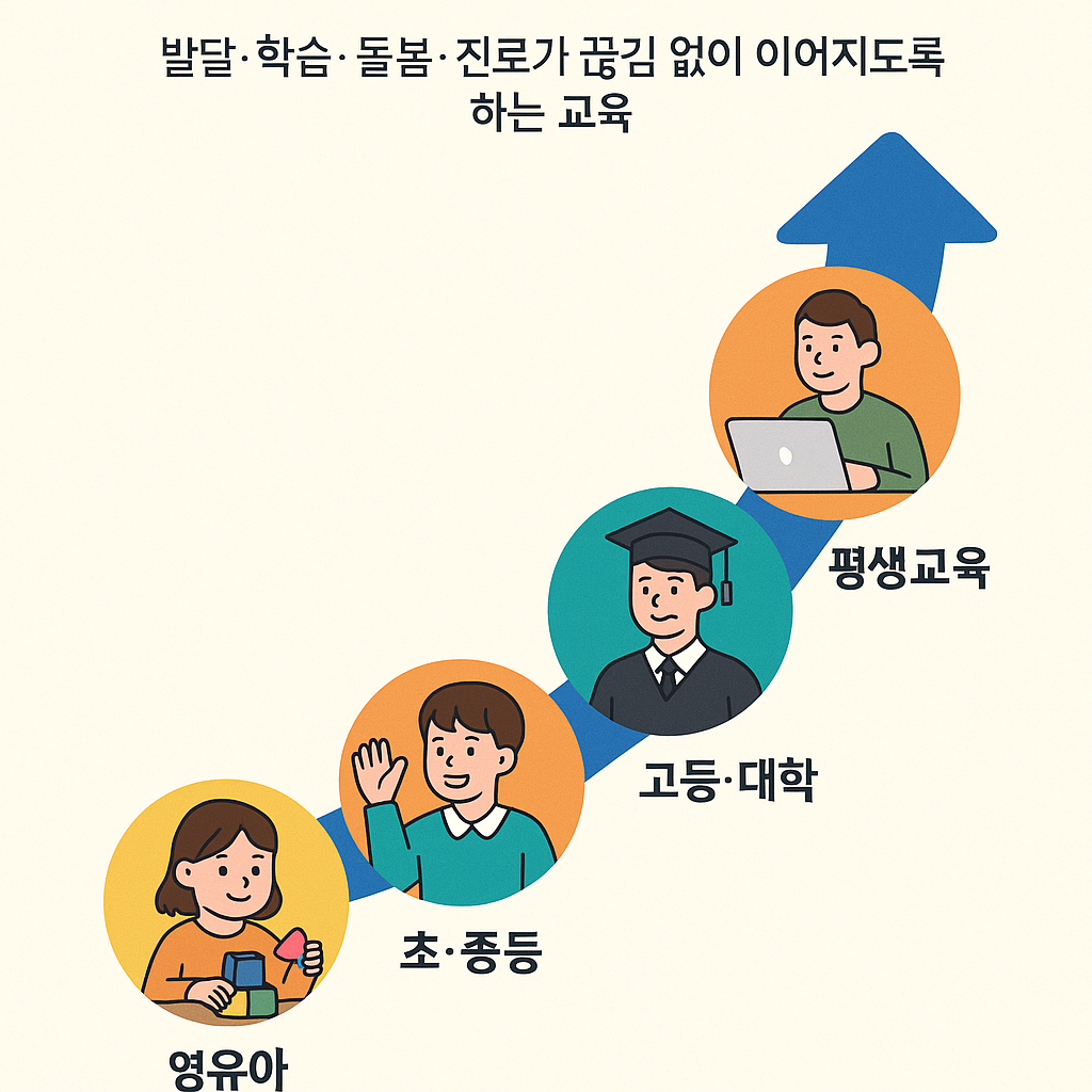 - 고교–대학 이음: 고교학점제와 대학 선이수제, 연계 교육과정을 통해 학습자가 진로를 단절 없이 확장.